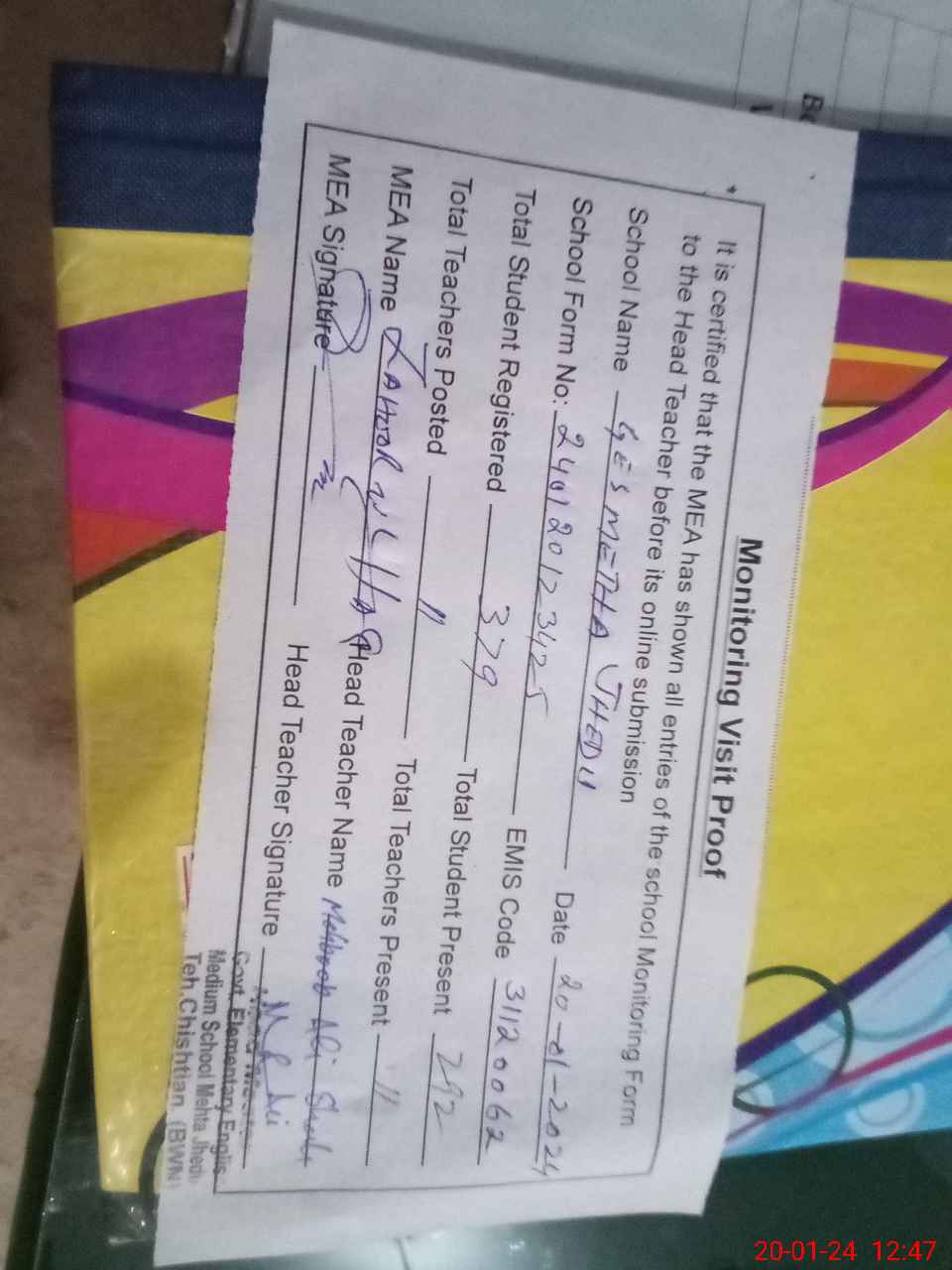 | Attendance Register | Head Teacher | MEA with School | Visit Proof |