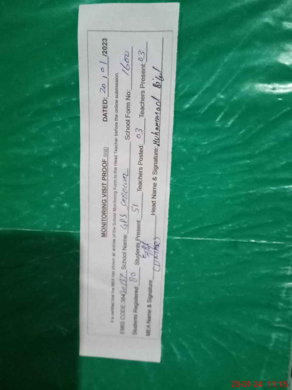 | Attendance Register | Head Teacher | MEA with School | Visit Proof |
