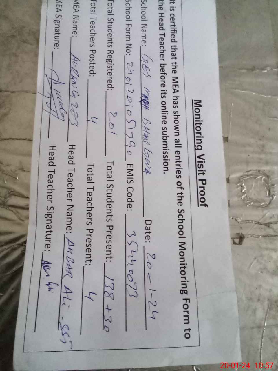 | Attendance Register | Head Teacher | MEA with School | Visit Proof |