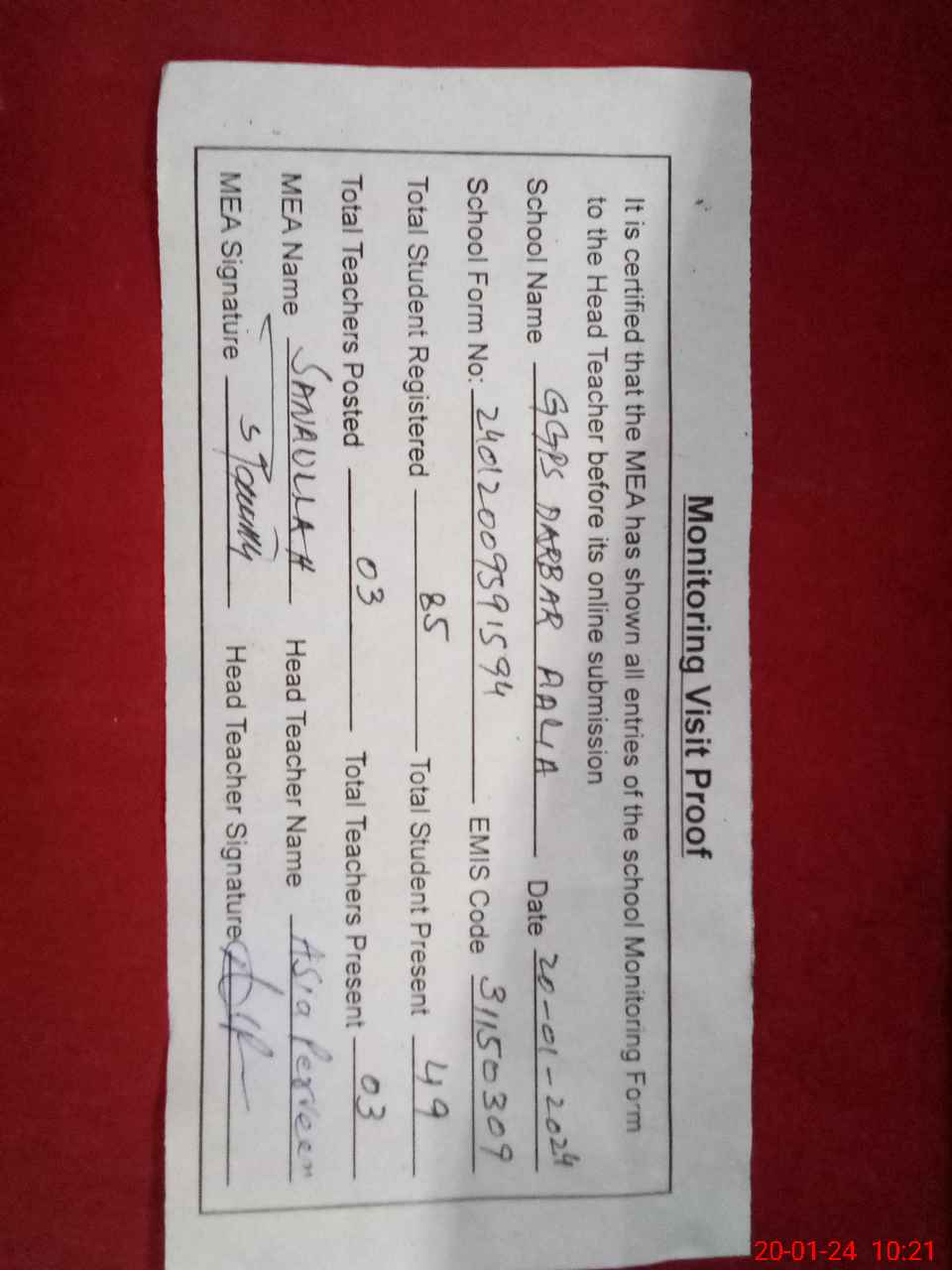 | Attendance Register | Head Teacher | MEA with School | Visit Proof |