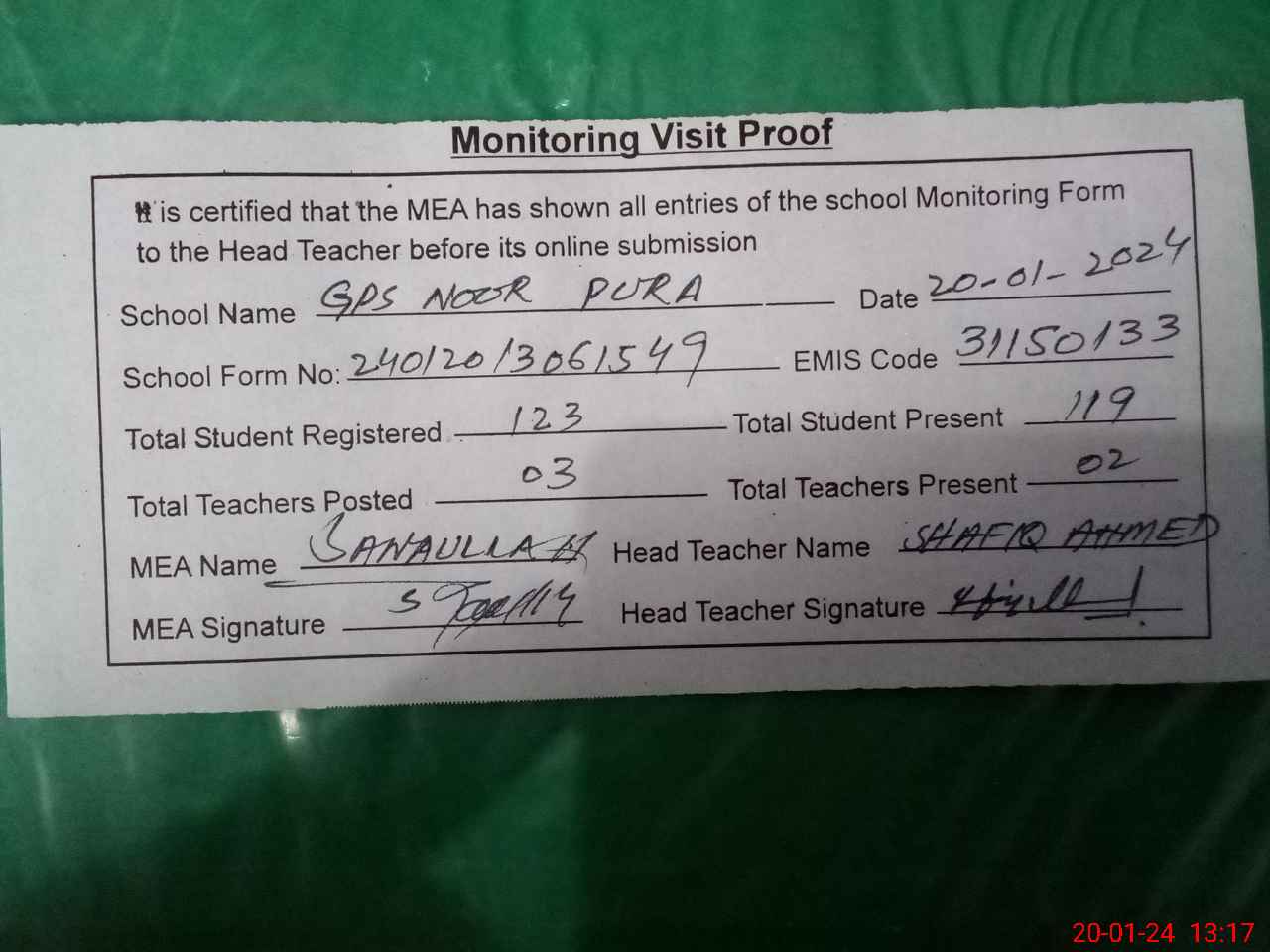 | Attendance Register | Head Teacher | MEA with School | Visit Proof |