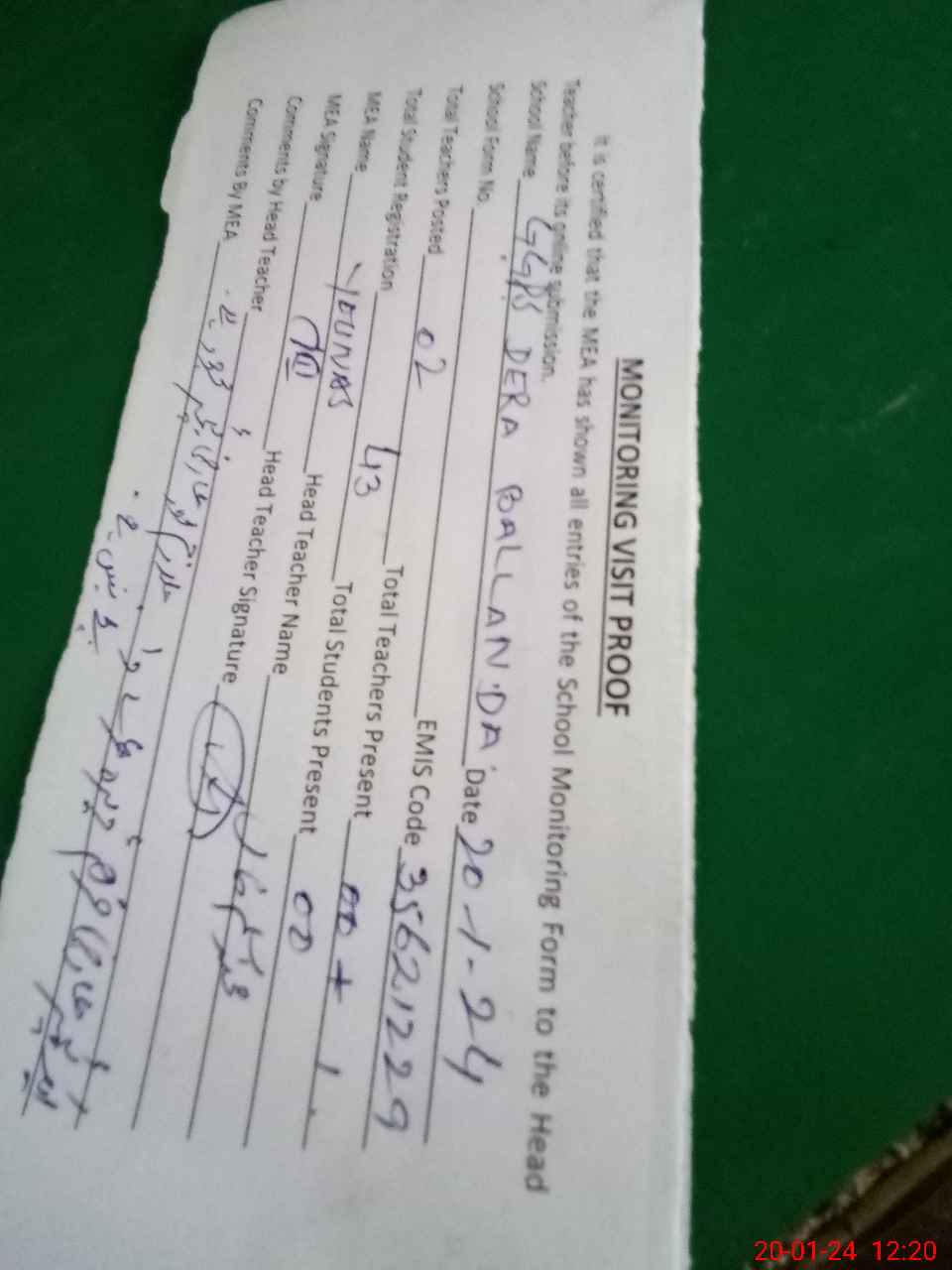 | Attendance Register | Head Teacher | MEA with School | Visit Proof |