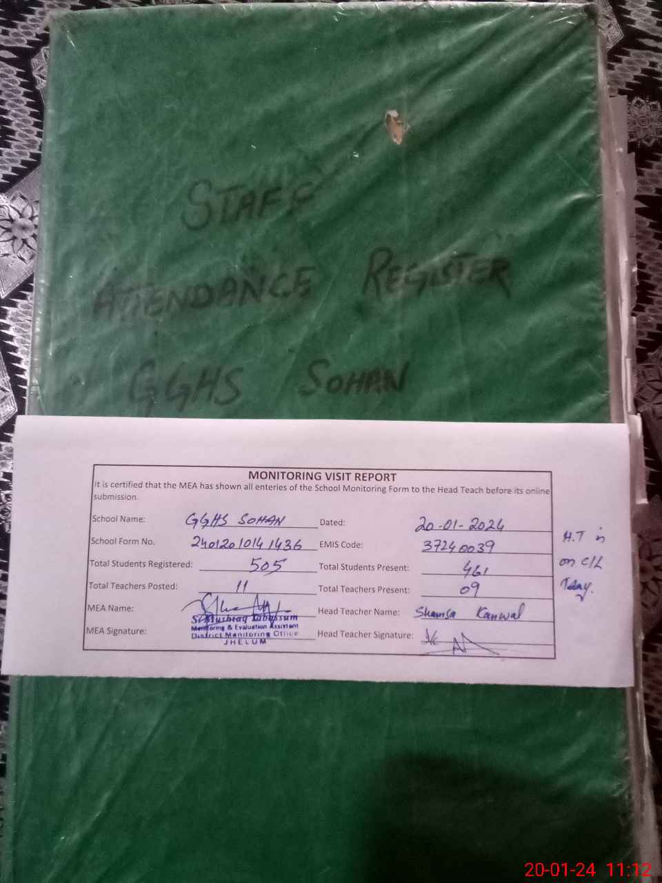 | Attendance Register | Head Teacher | MEA with School | Visit Proof |