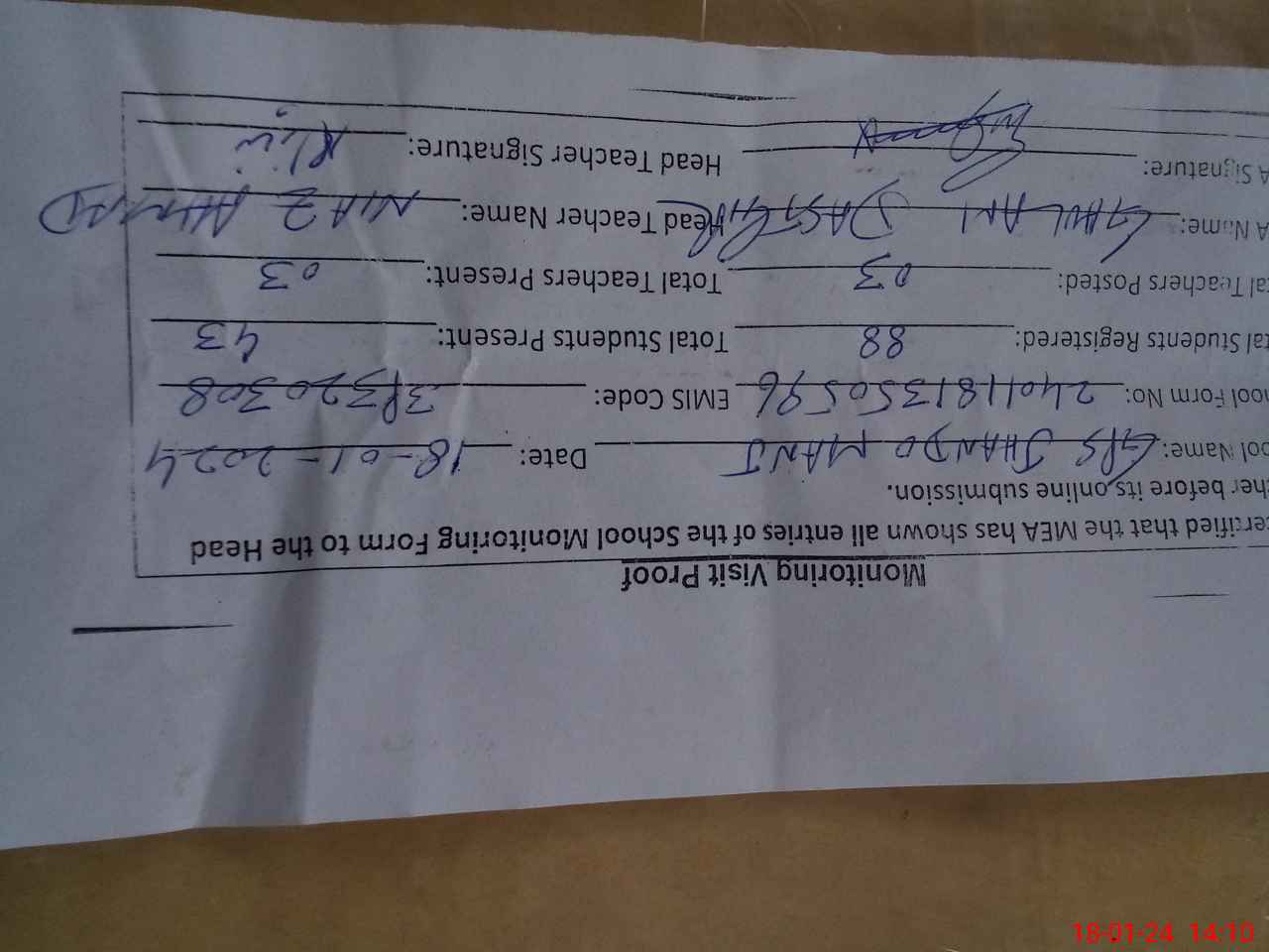 | Certified that this School was Inspected by the Undersigned MEA/DMO Today and the Information Stated Above is as Per Record. | |||||