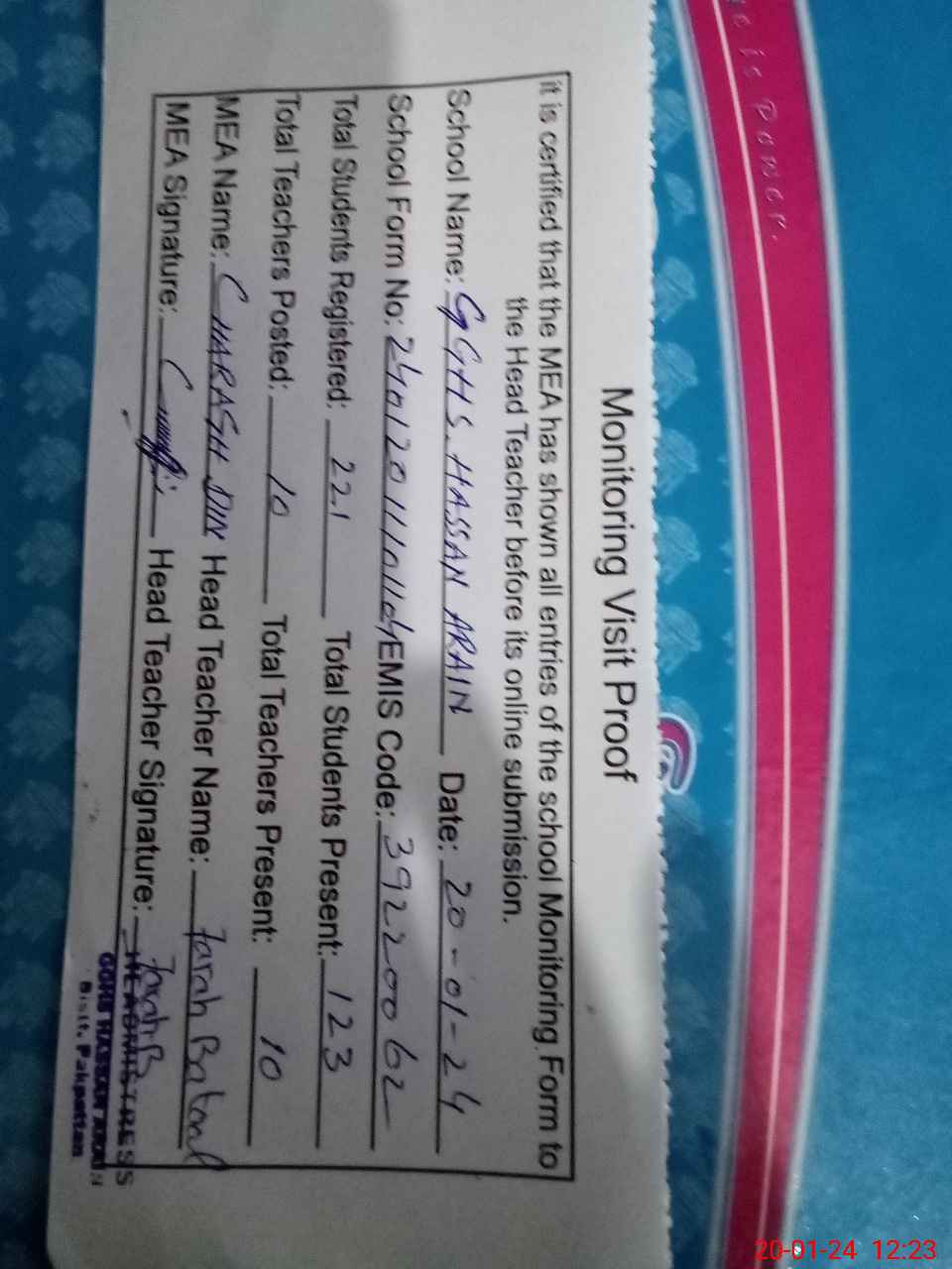 | EMIS Code: 39220062 | Name of School: GGHS HASSAN ARAIN | |||