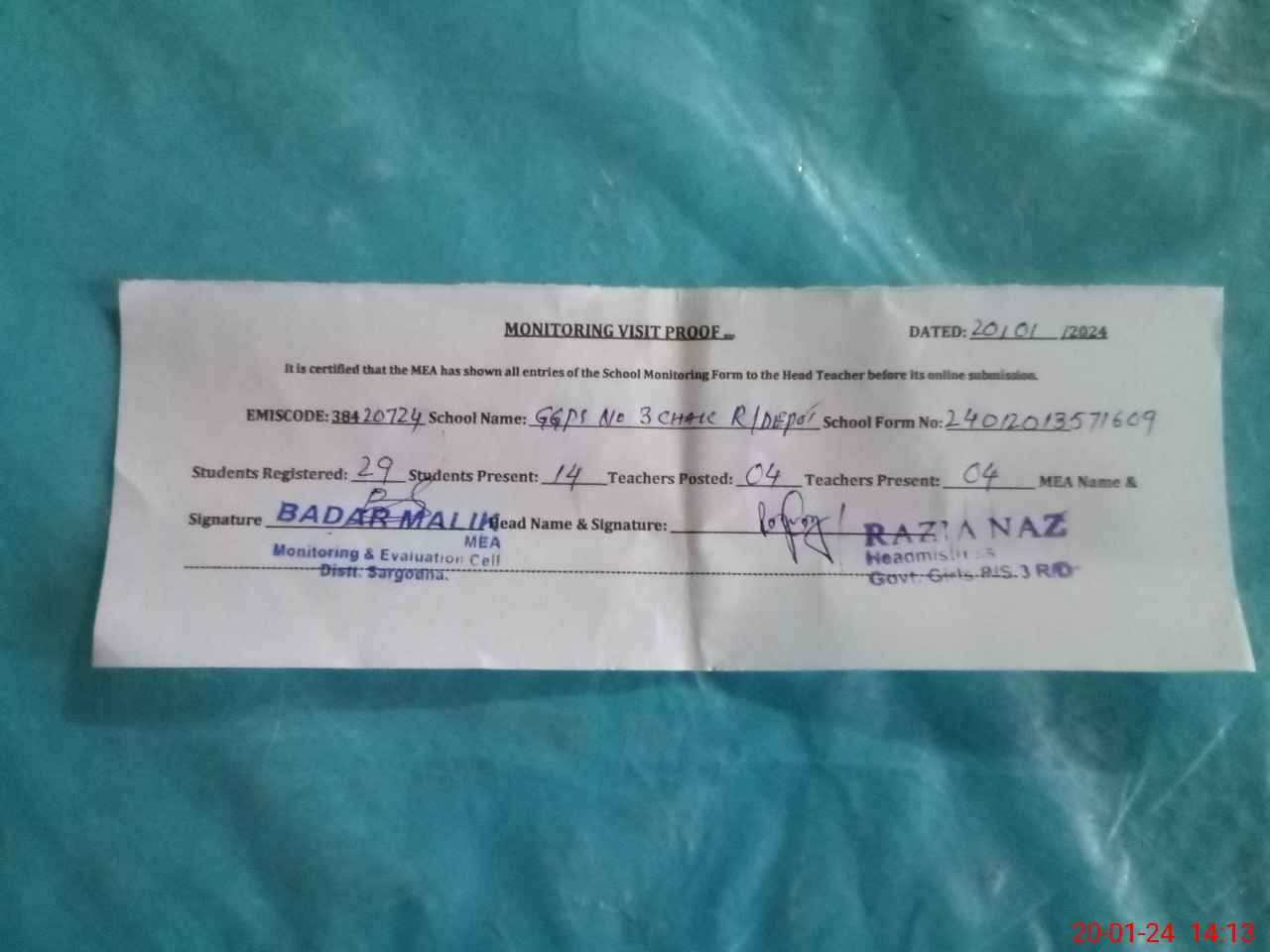 | Attendance Register | Head Teacher | MEA with School | Visit Proof |