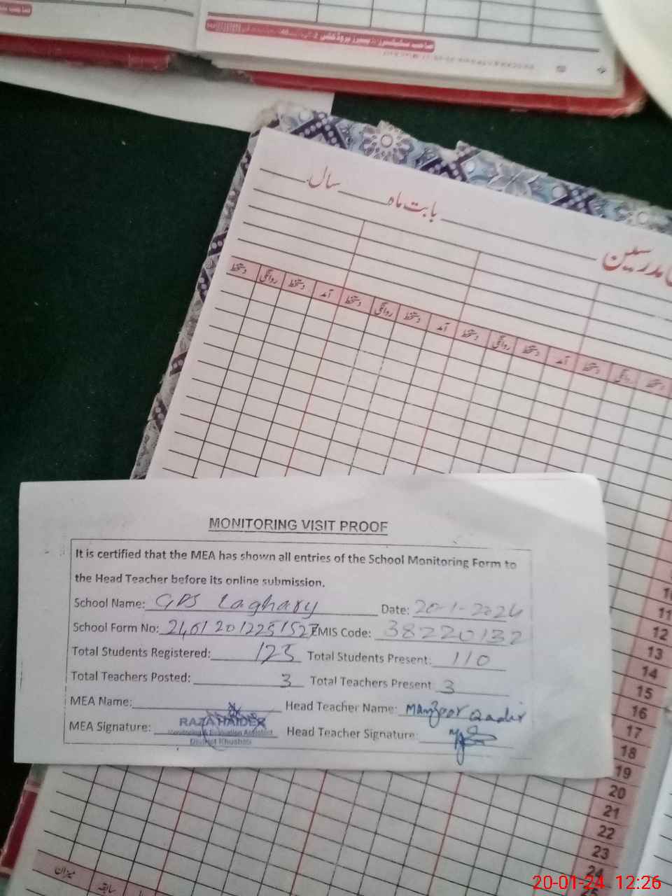 | Attendance Register | Head Teacher | MEA with School | Visit Proof |