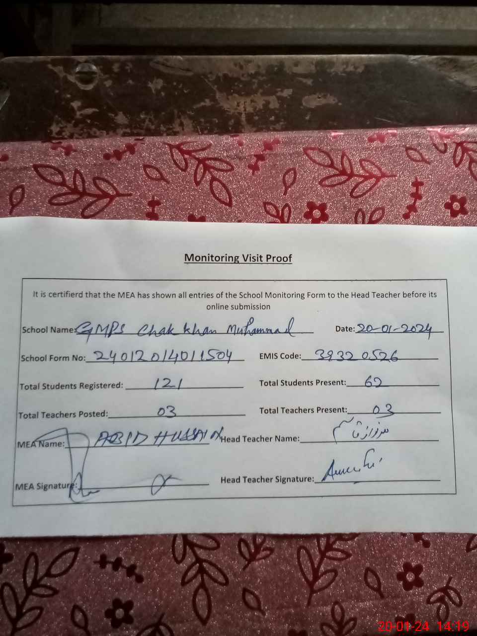 | Attendance Register | Head Teacher | MEA with School | Visit Proof |