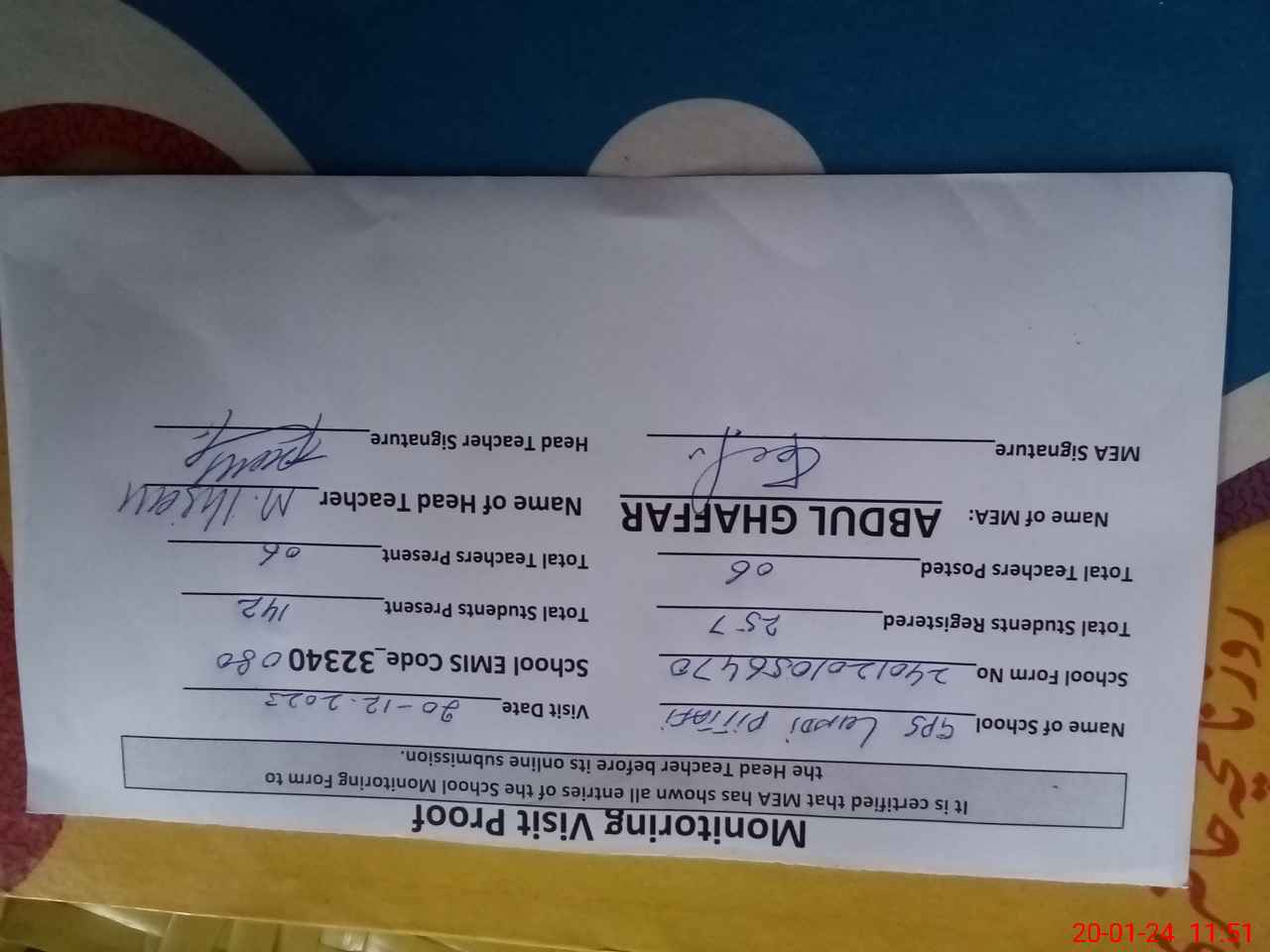 | Attendance Register | Head Teacher | MEA with School | Visit Proof |