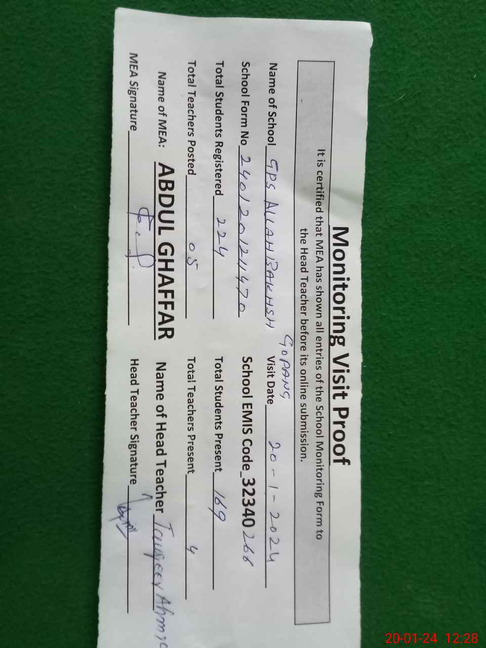 | Attendance Register | Head Teacher | MEA with School | Visit Proof |