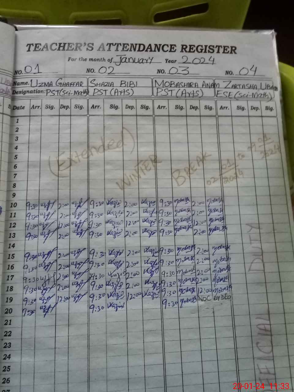 | Remarks (Use Separate Page if Required): Nsb not updated on sis Teacher zartasha ubaib not tage on sis she is on duty in DEO office | |||||