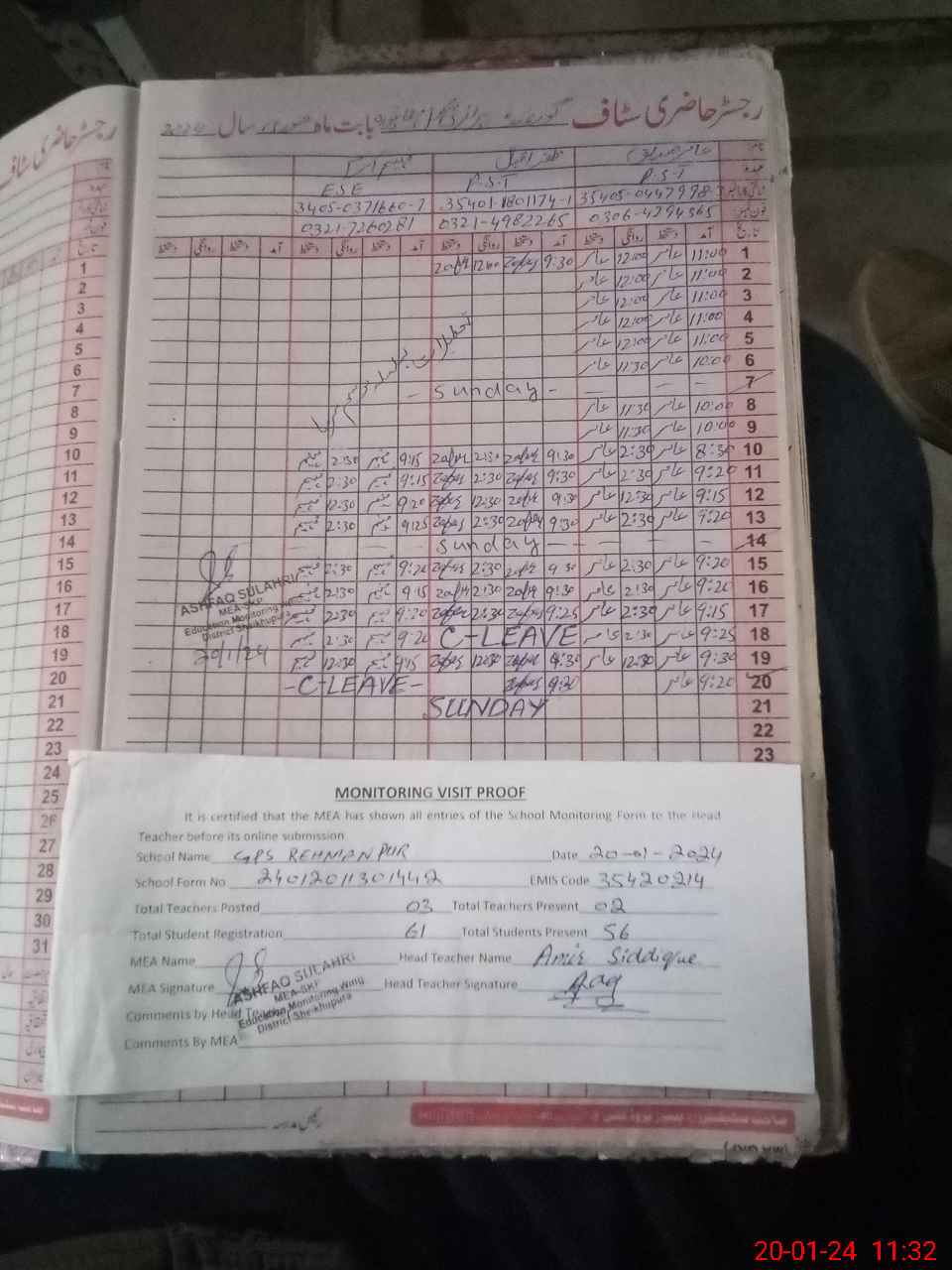 | Attendance Register | Head Teacher | MEA with School | Visit Proof |