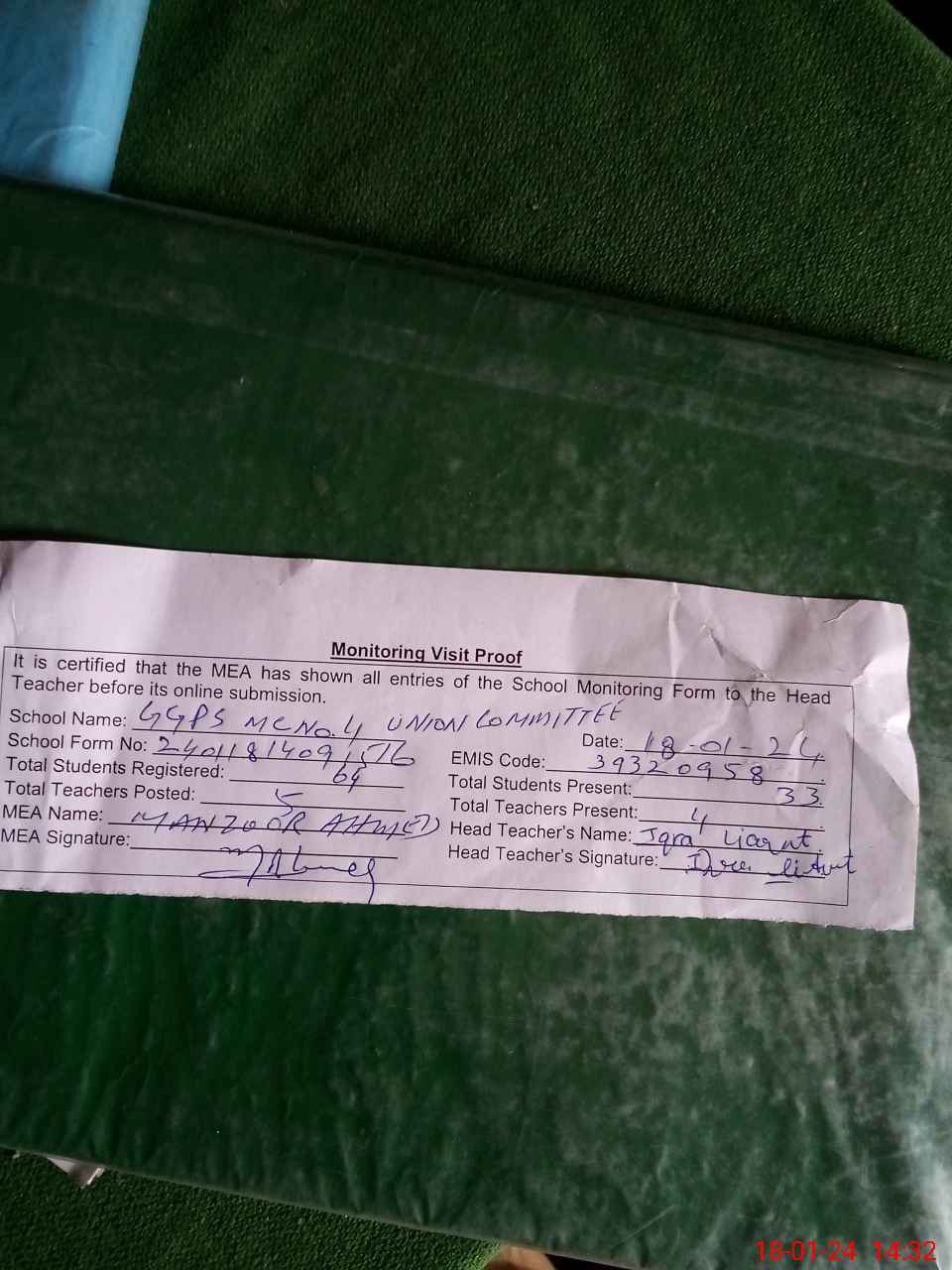 | Attendance Register | Head Teacher | MEA with School | Visit Proof |