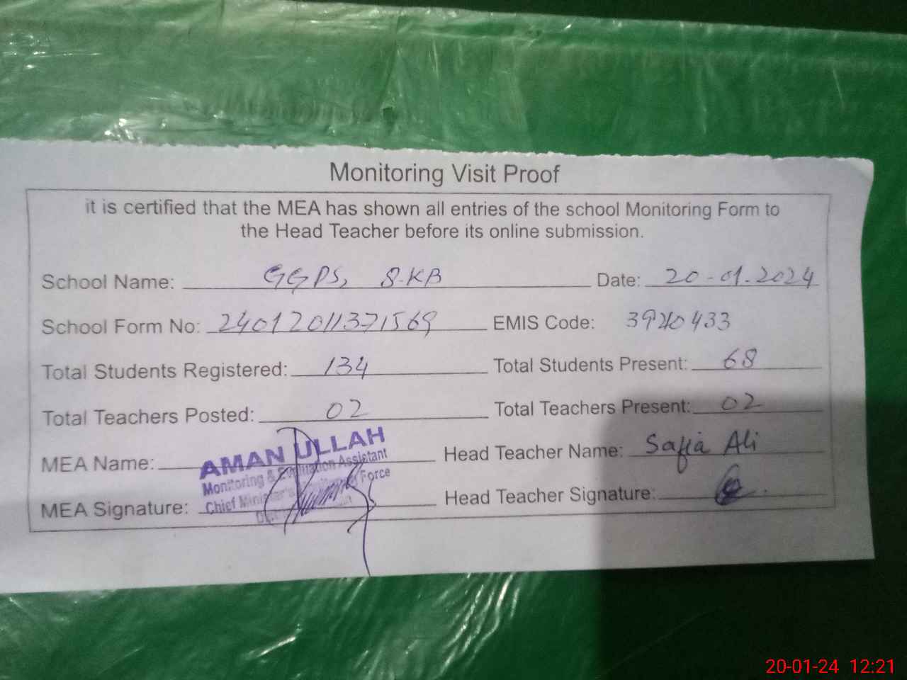 | Attendance Register | Head Teacher | MEA with School | Visit Proof |