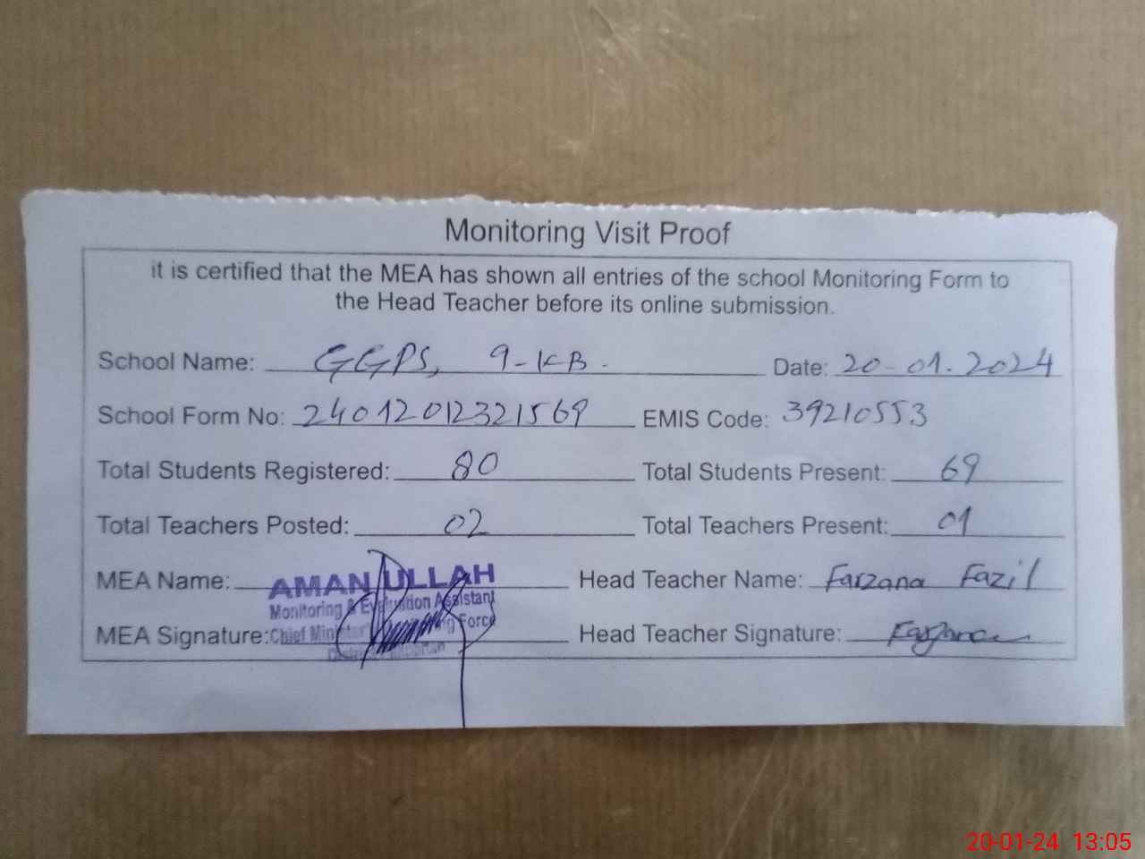 | Attendance Register | Head Teacher | MEA with School | Visit Proof |