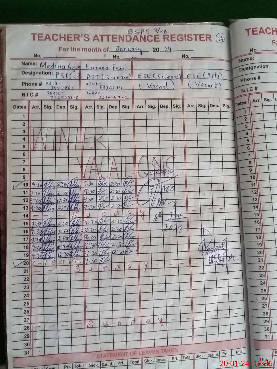| CNIC | Full Name | Designation | R/C | Absence During Last Calender Month |
