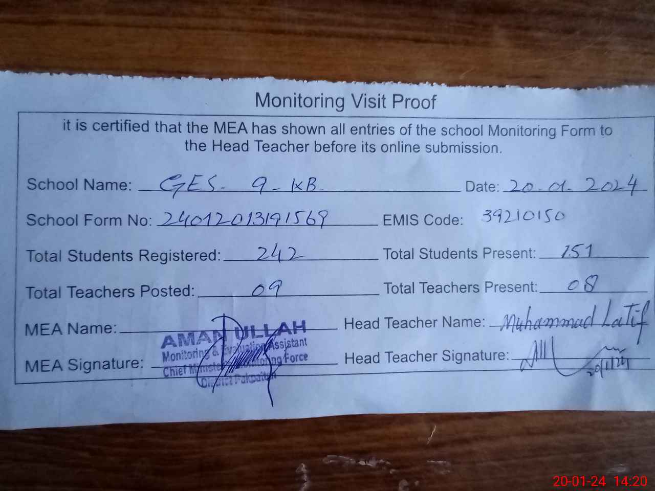 | Attendance Register | Head Teacher | MEA with School | Visit Proof |