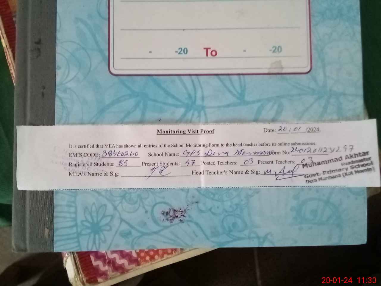 | Attendance Register | Head Teacher | MEA with School | Visit Proof |