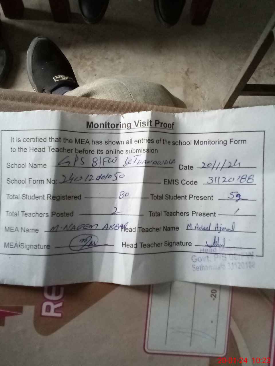 | Attendance Register | Head Teacher | MEA with School | Visit Proof |