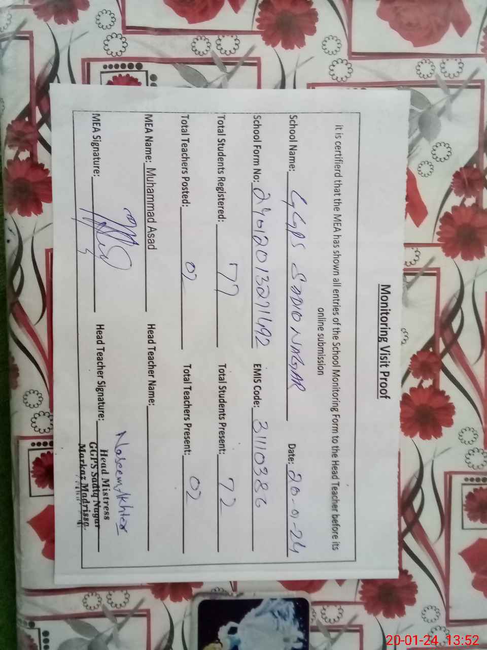 | Attendance Register | Head Teacher | MEA with School | Visit Proof |