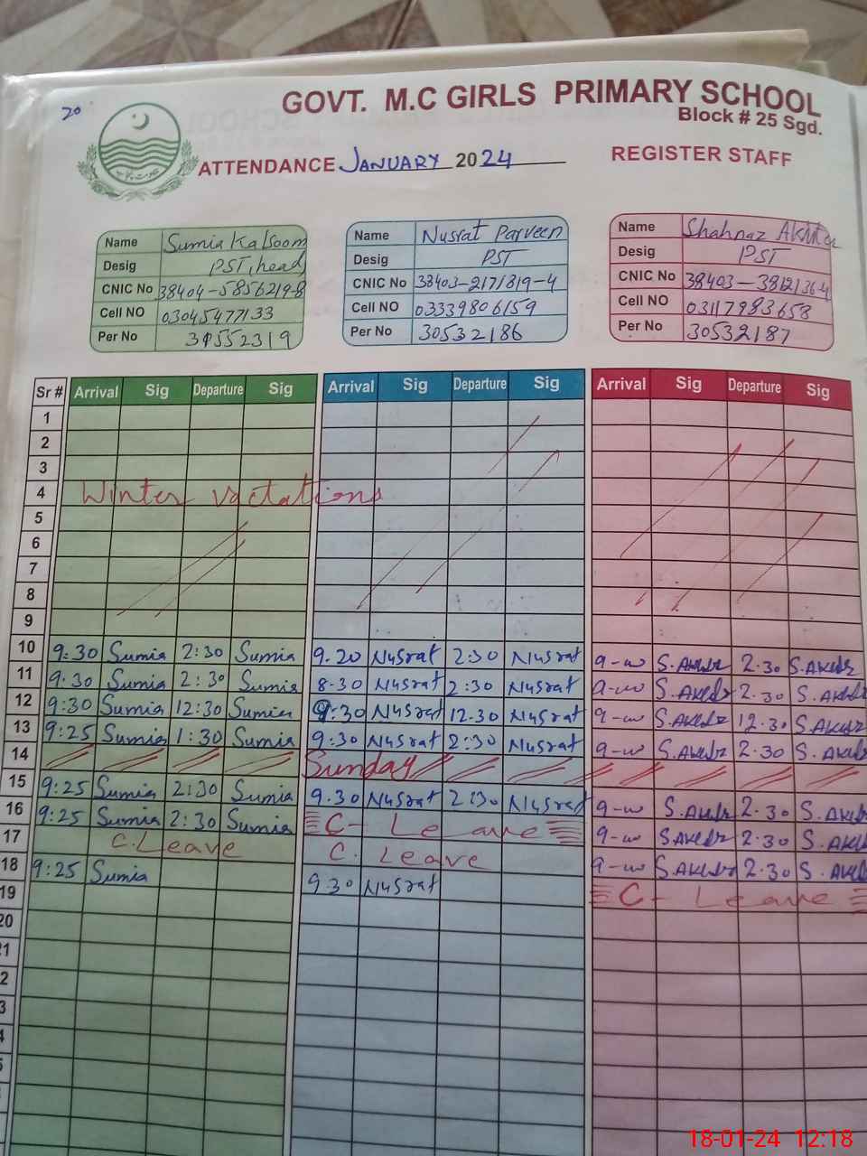 | CNIC | Full Name | Designation | R/C | Absence During Last Calender Month |