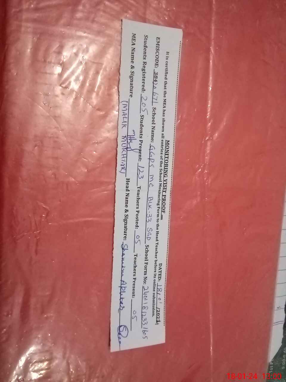 | Attendance Register | Head Teacher | MEA with School | Visit Proof |