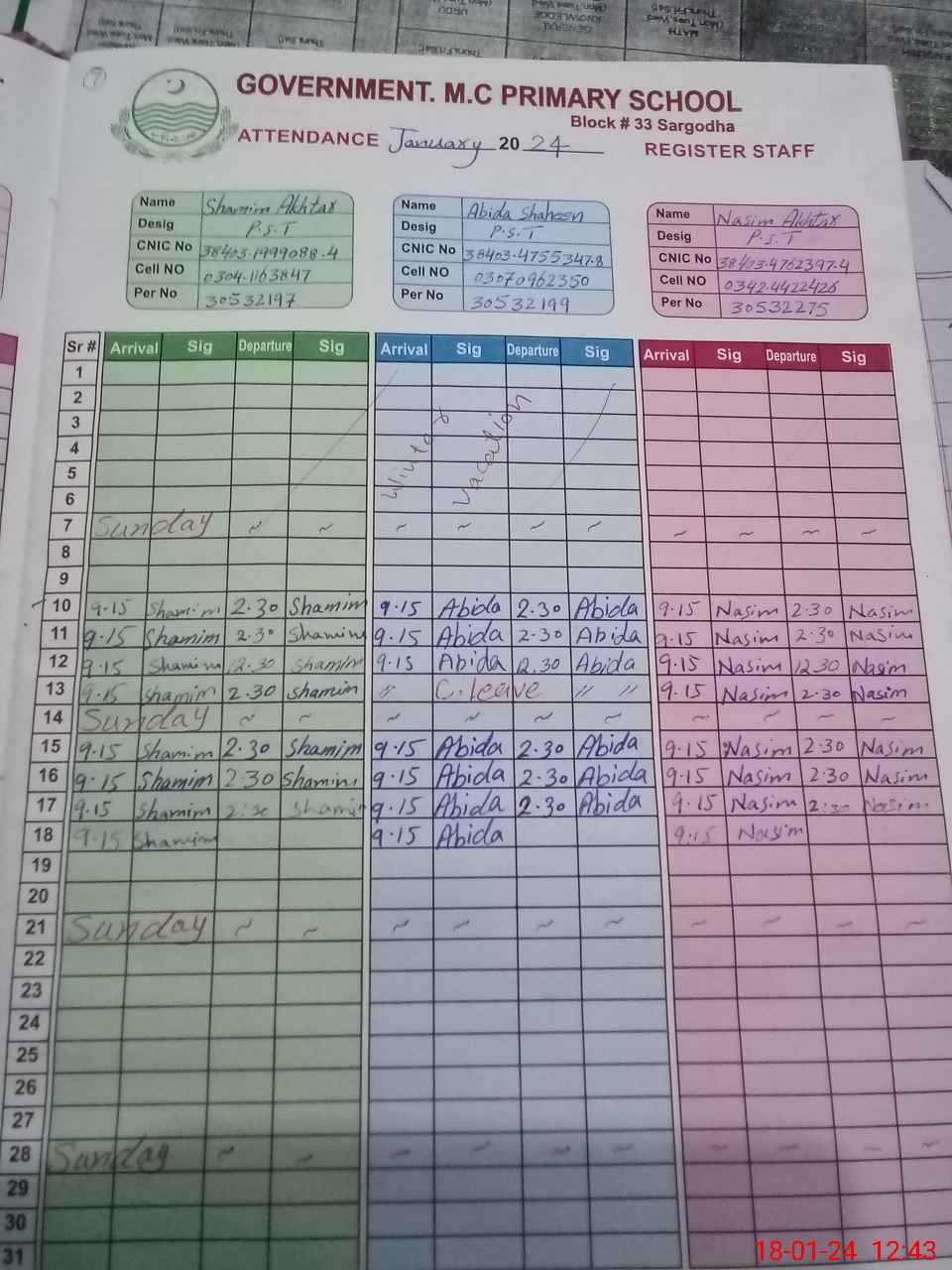 | CNIC | Full Name | Designation | R/C | Absence During Last Calender Month |