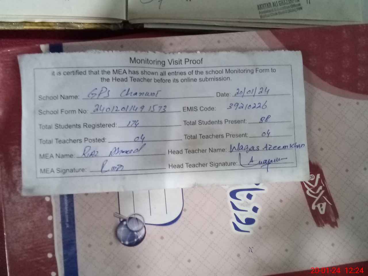 | Attendance Register | Head Teacher | MEA with School | Visit Proof |