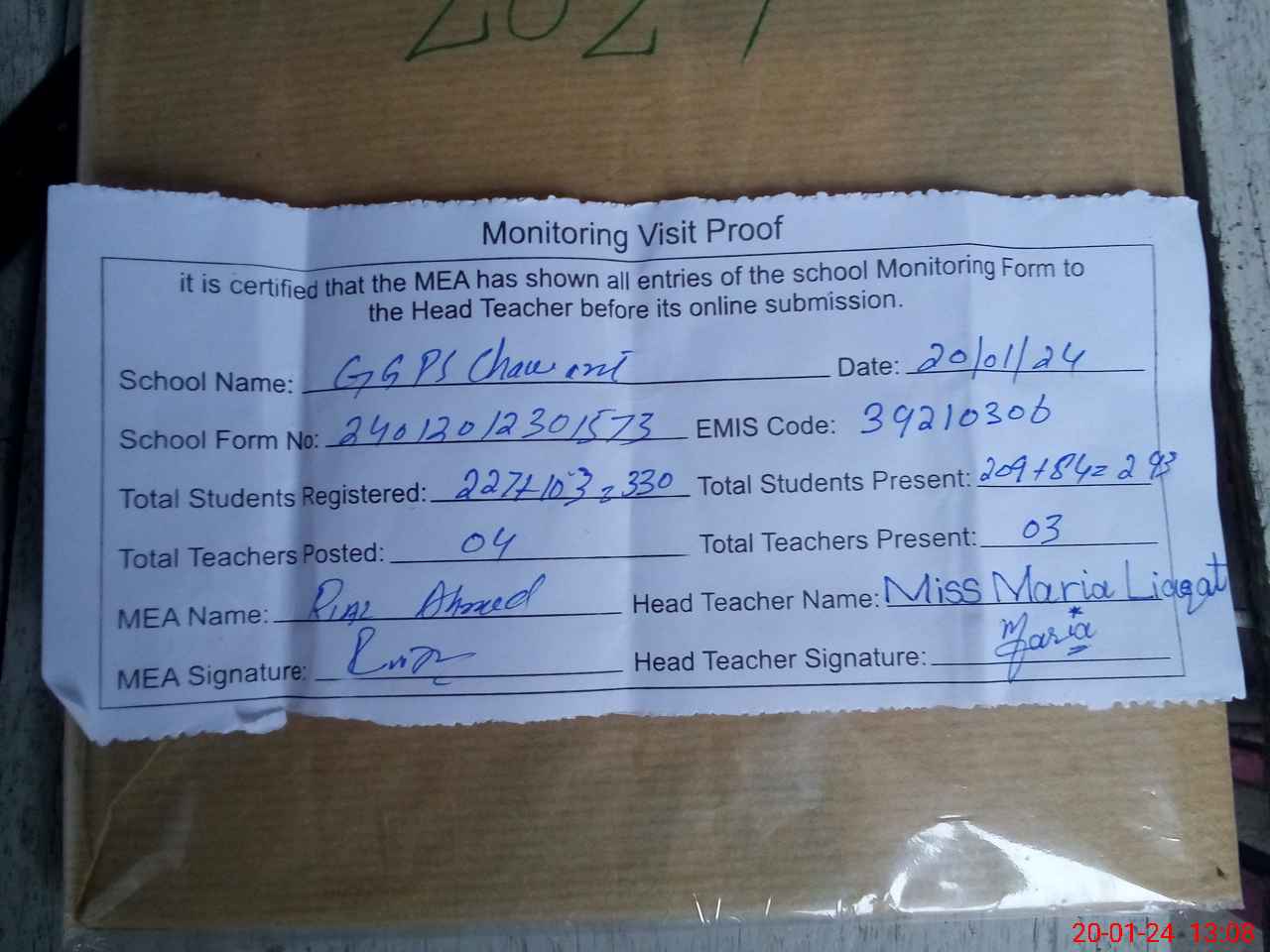 | Attendance Register | Head Teacher | MEA with School | Visit Proof |