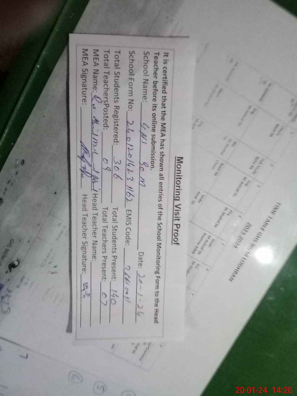 | Attendance Register | Head Teacher | MEA with School | Visit Proof |