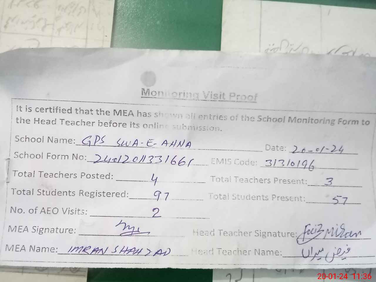 | Attendance Register | Head Teacher | MEA with School | Visit Proof |
