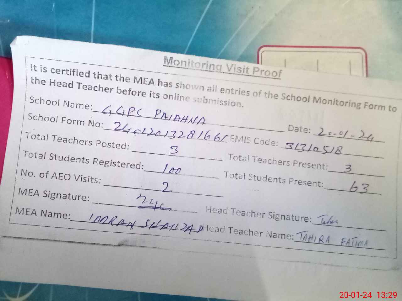 | Attendance Register | Head Teacher | MEA with School | Visit Proof |