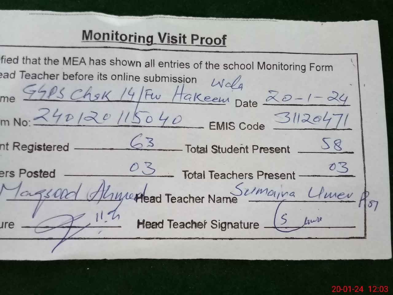 | Attendance Register | Head Teacher | MEA with School | Visit Proof |