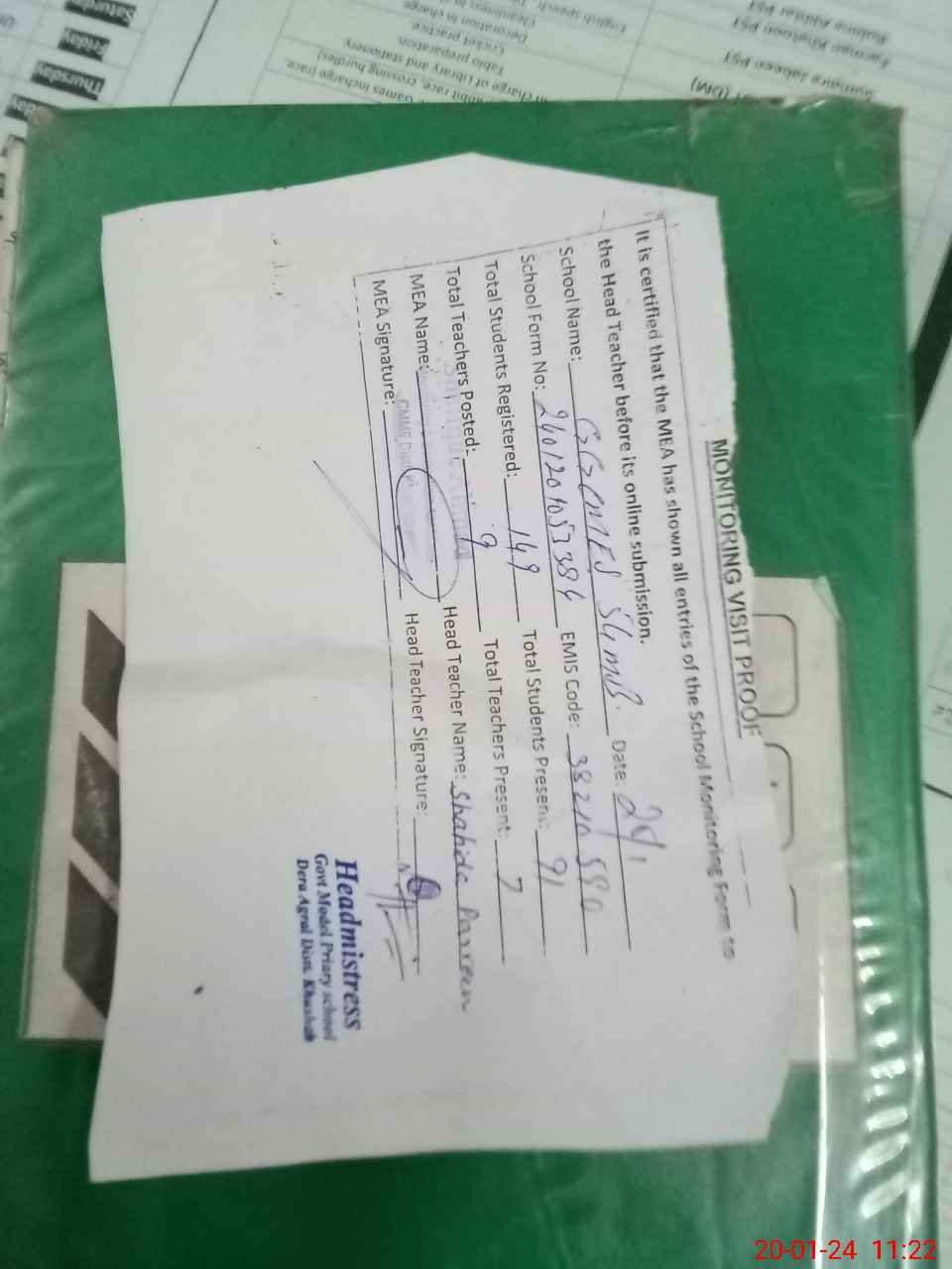 | Attendance Register | Head Teacher | MEA with School | Visit Proof |