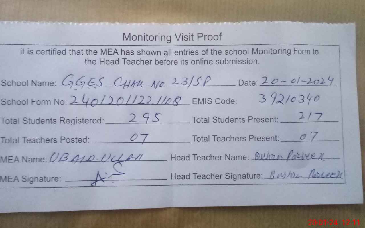 | Attendance Register | Head Teacher | MEA with School | Visit Proof |