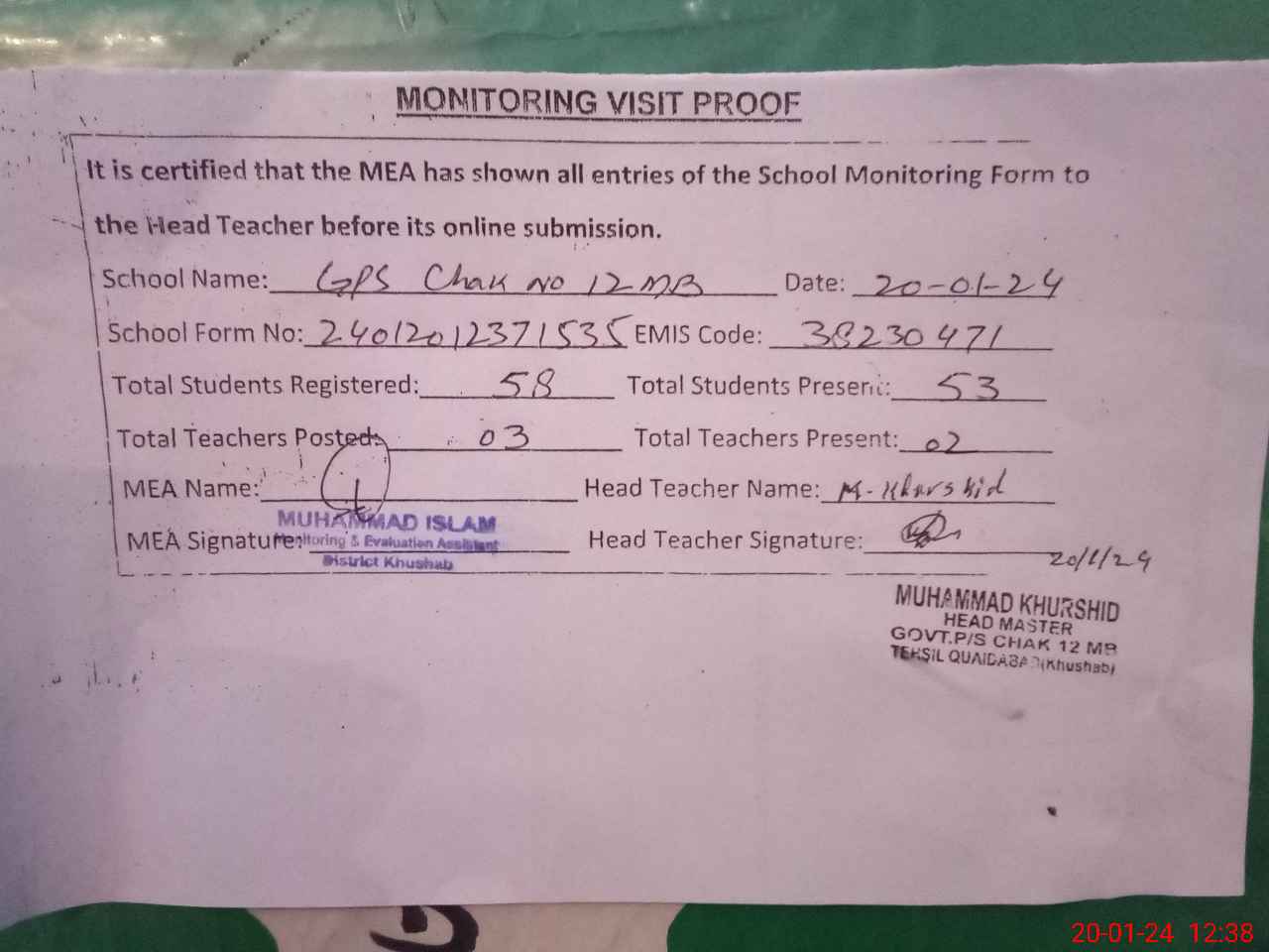 | EMIS Code: 38230471 | Name of School: GPS CHAK NO. 12 MB | |||