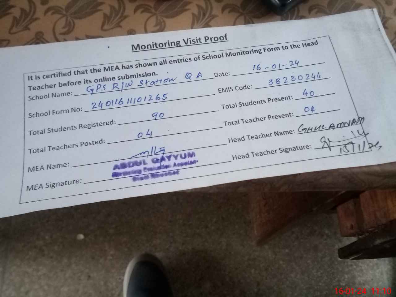| Attendance Register | Head Teacher | MEA with School | Visit Proof |