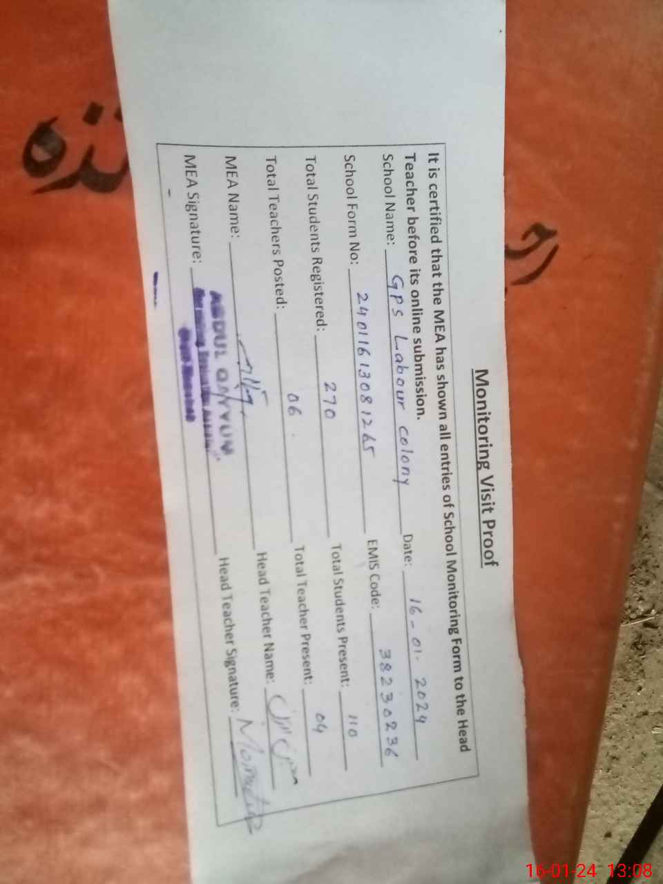 | Attendance Register | Head Teacher | MEA with School | Visit Proof |