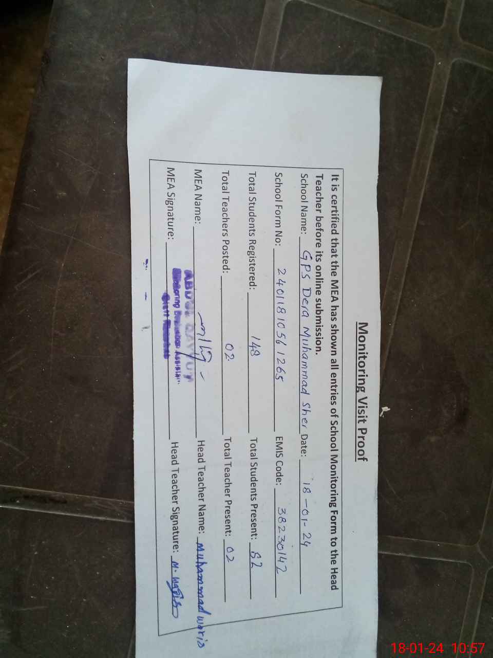 | Attendance Register | Head Teacher | MEA with School | Visit Proof |