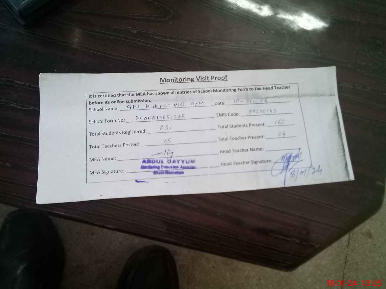 | Attendance Register | Head Teacher | MEA with School | Visit Proof |
