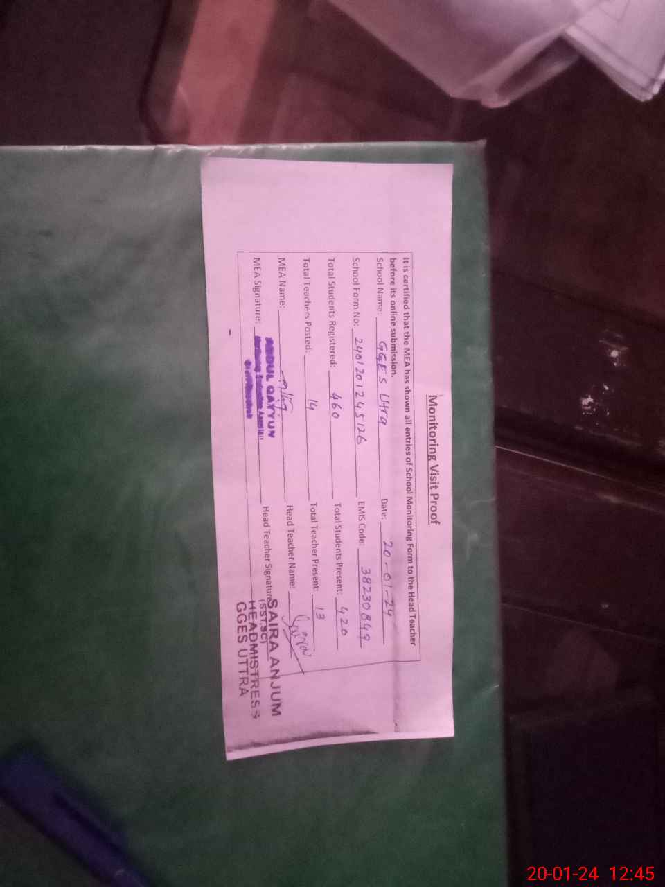 | Attendance Register | Head Teacher | MEA with School | Visit Proof |