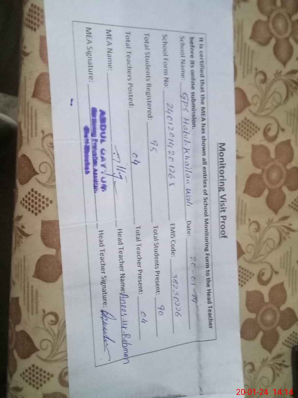 | Attendance Register | Head Teacher | MEA with School | Visit Proof |