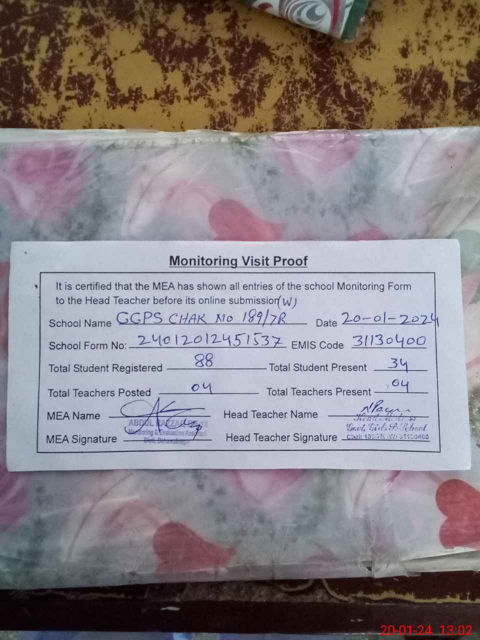 | Attendance Register | Head Teacher | MEA with School | Visit Proof |