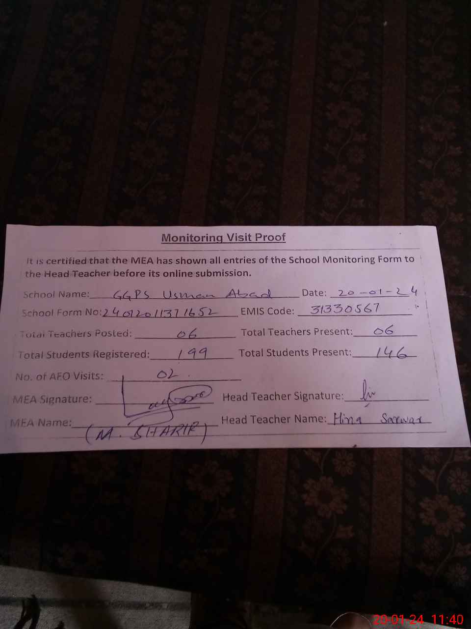 | EMIS Code: 31330567 | Name of School: GGPS USMAN ABAD | |||