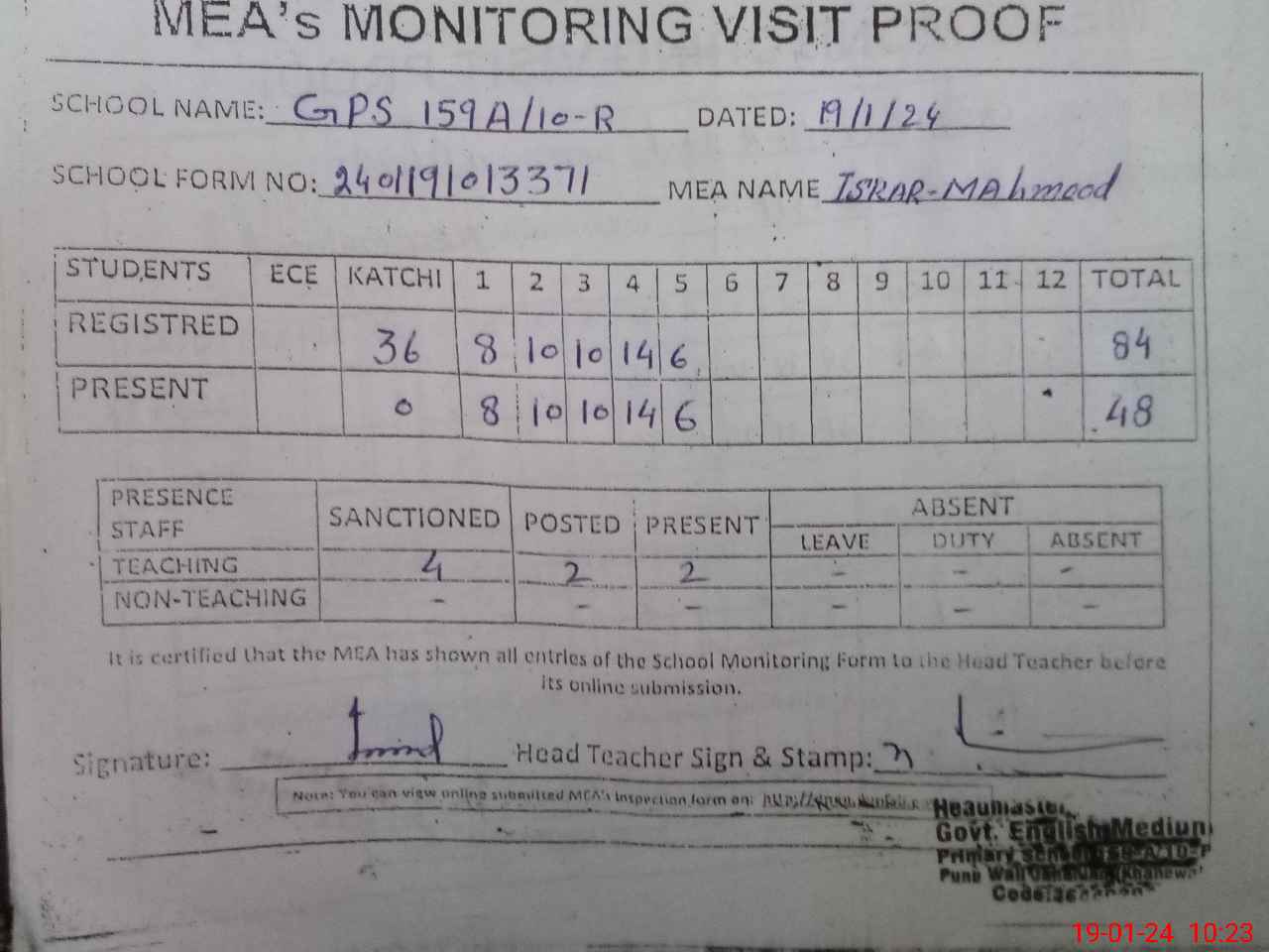 | Attendance Register | Head Teacher | MEA with School | Visit Proof |