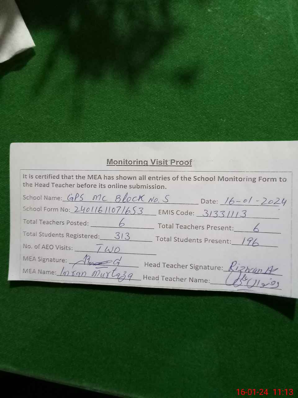 | EMIS Code: 31331113 | Name of School: GPS MC BLOCK NO. 5 INHAR COLONY | |||