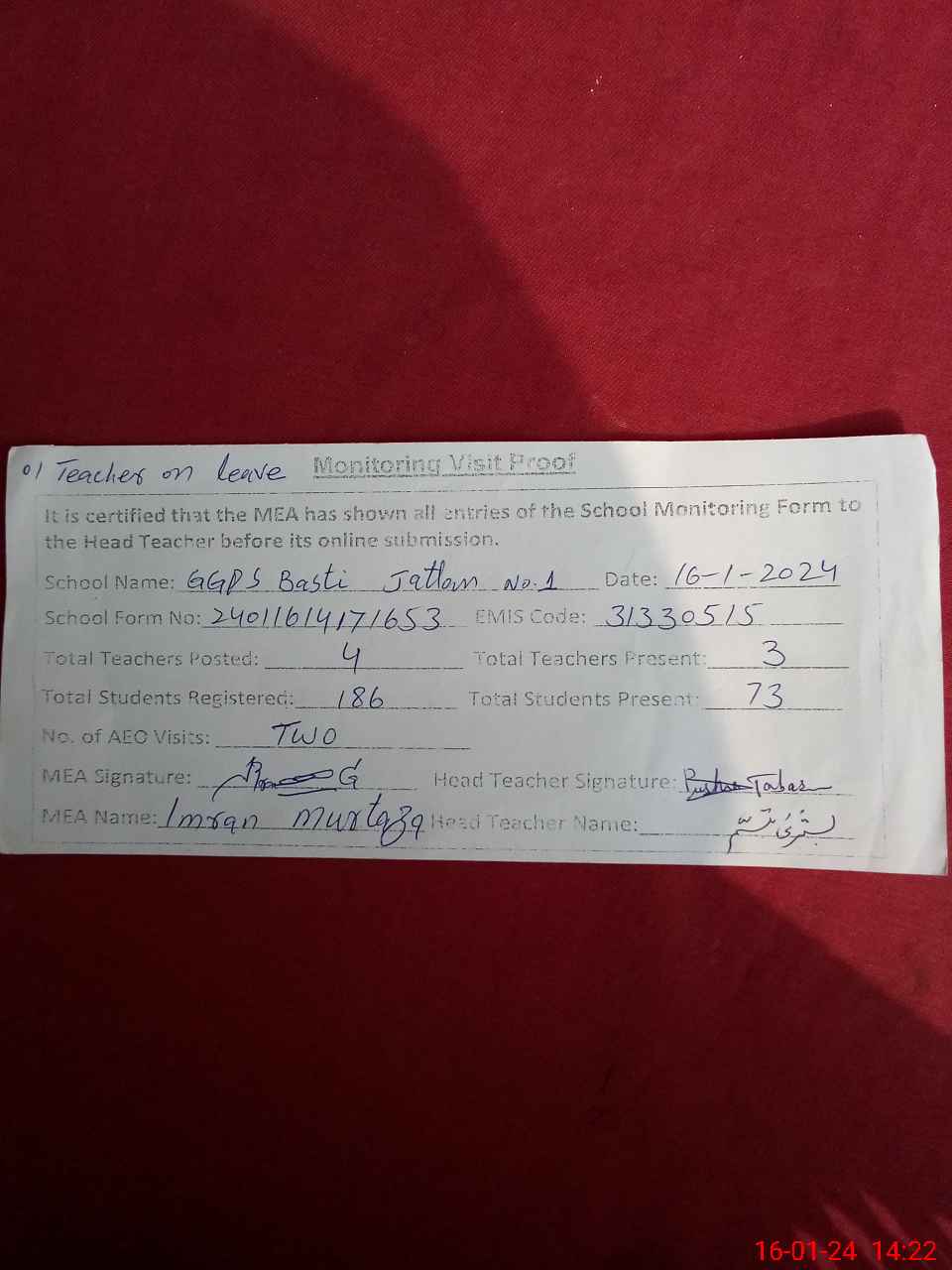 | Attendance Register | Head Teacher | MEA with School | Visit Proof |