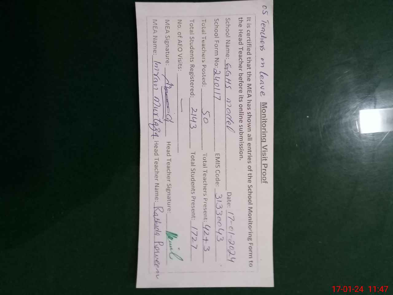 | Attendance Register | Head Teacher | MEA with School | Visit Proof |