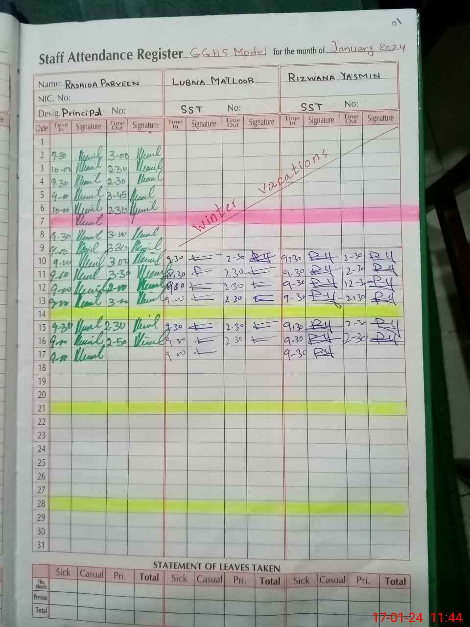 | CNIC | Full Name | Designation | R/C | Absence During Last Calender Month |