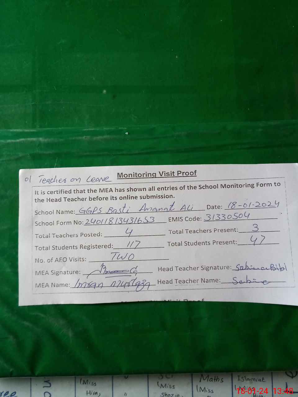 | Attendance Register | Head Teacher | MEA with School | Visit Proof |